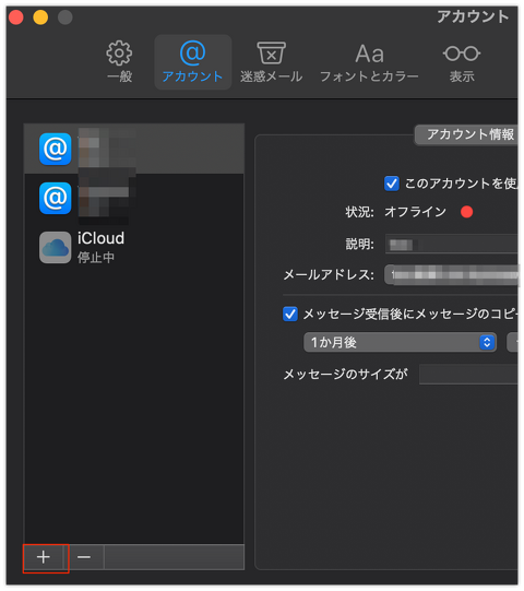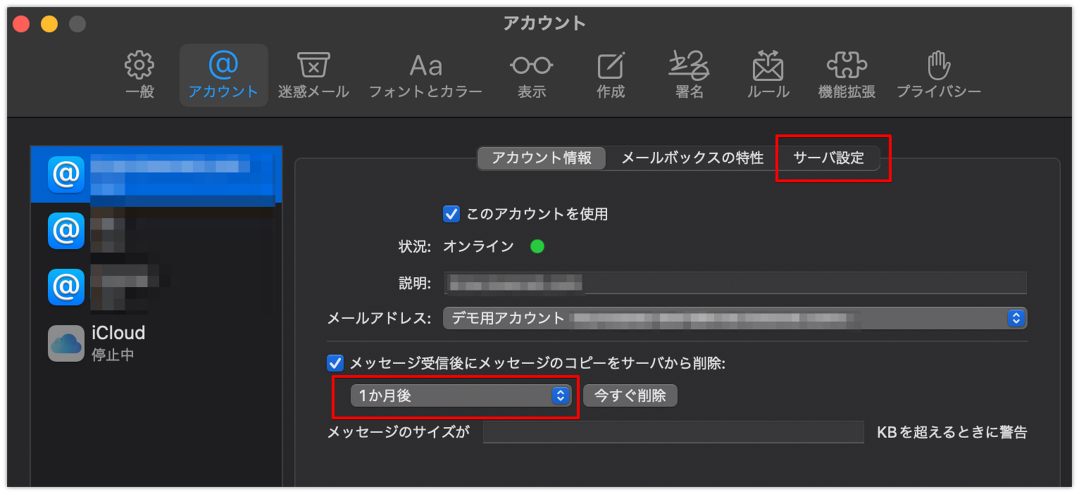 追加完了したアカウントの、「メッセージ受信後にメッセージのコピーをサーバから削除」の項にチェックが入っており、