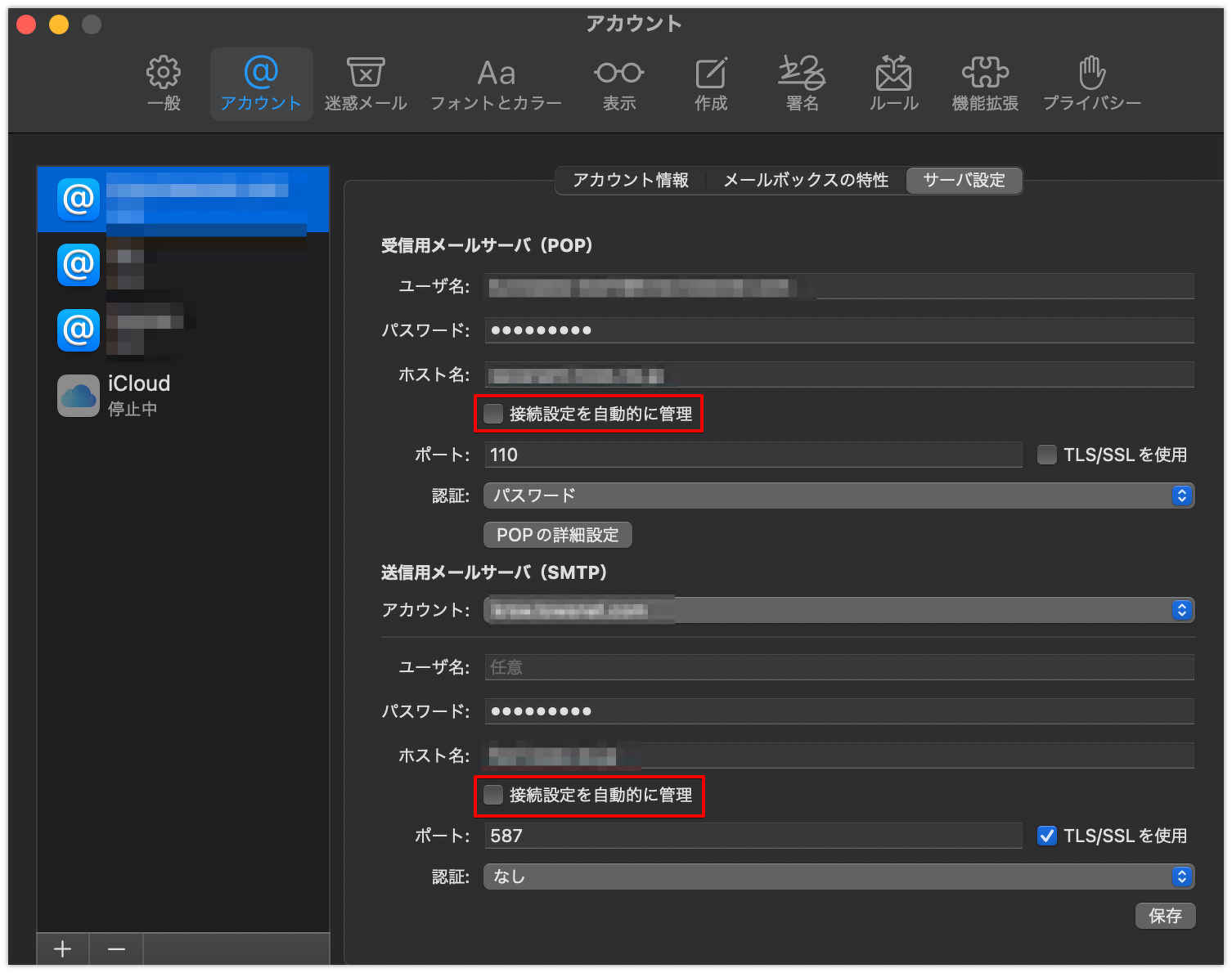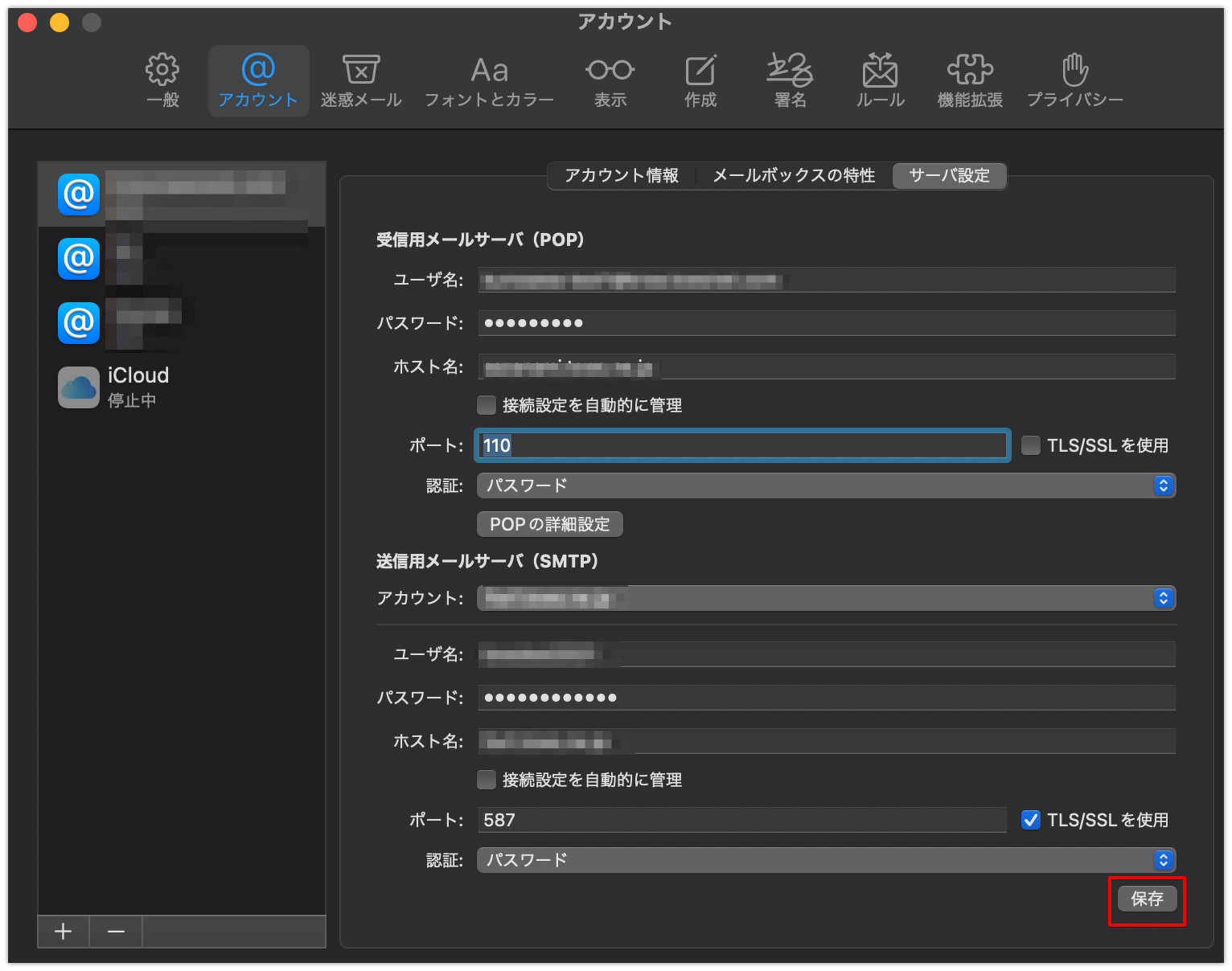 ここではユーザ名が受信用設定と同じになっているアカウントを「-(マイナス)」で削除してください。