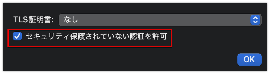 ・「セキュリティ保護されていない認証を許可」: チェックあり。
