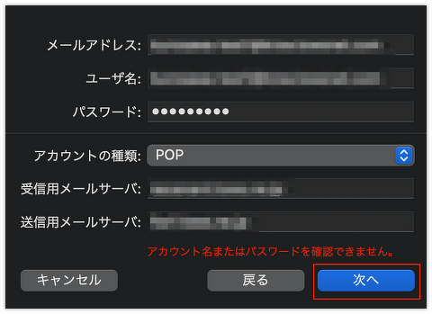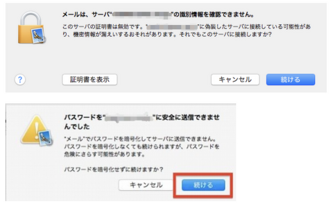 「アカウント名またはパスワードを確認できません。」と出ますが、 仕様上どうしても表示されます。そのまま続けてください。
