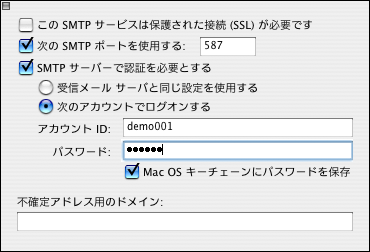 ・SMTPサーバーで認証を必要とする:チェックを入れ、「次のアカウントでログオンする」を選択、 送信用のアカウントIDとパスワードを入力、「Mac OS キーチェーンにパスワードを保存」をチェックします。