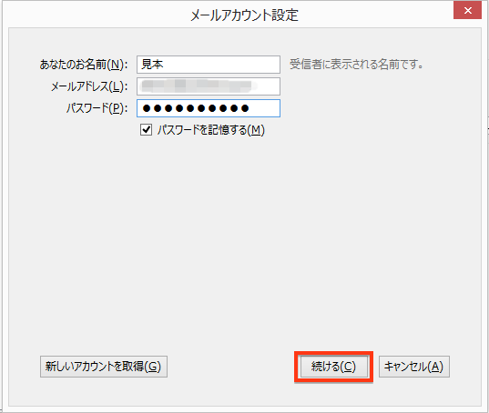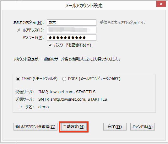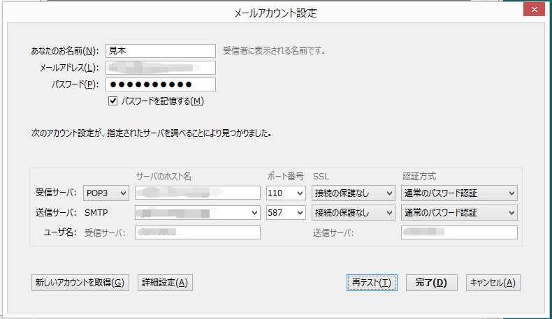ユーザ名:お客様アカウントの受信サーバ・送信サーバそれぞれのユーザ名(アカウントID)を入力してください。