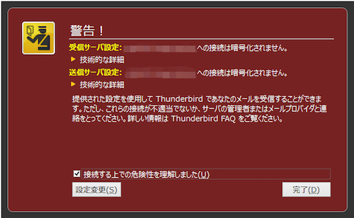 「接続する上での危険性を理解しました」にチェックを入れ、「完了」ボタンをクリックして下さい。