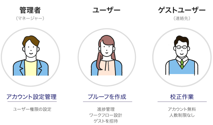 ユーザーごとに3種類の役割を付与し、詳細な権限設計をおこなえます。