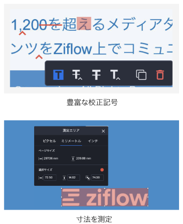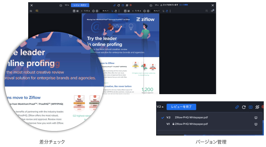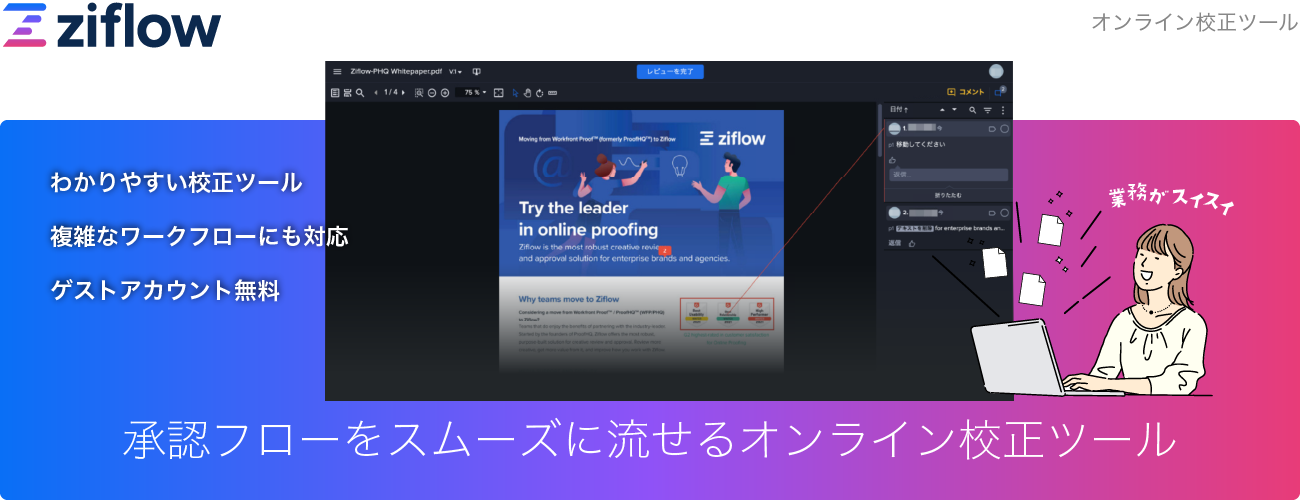 Ziflowとはあらゆる制作物のレビュー・承認フローを効率化する、オンライン校正ツールです。シンプルで誰でも使いやすいインターフェースながら、バージョン管理や差分チェック、共同作業など、校正業務に必要な機能が揃っています。詳細なワークフローやフォルダの設計が可能なため、現状の業務フローのオンライン化・自動化をスムーズに実現します。