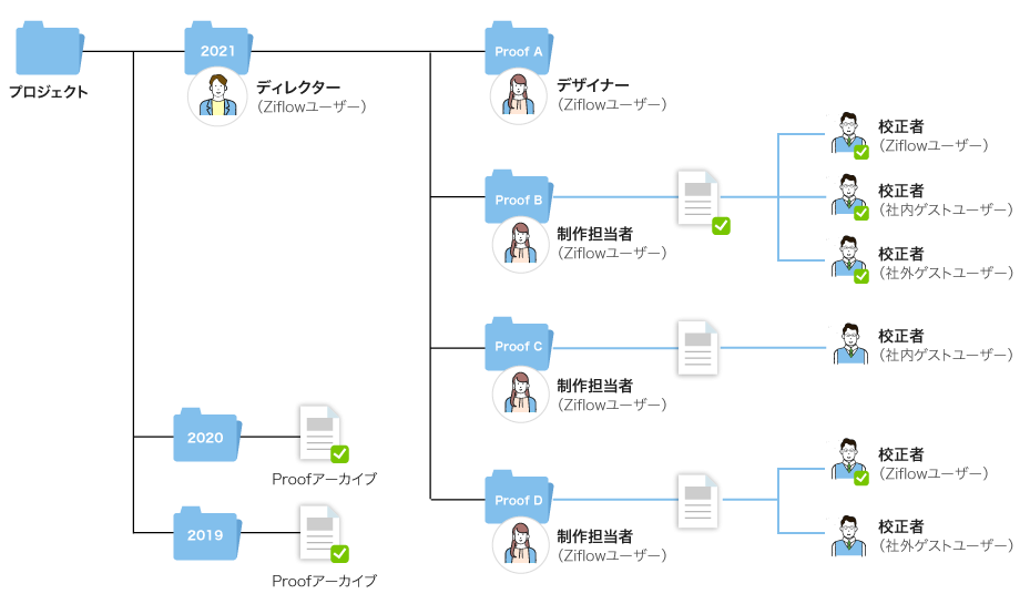 Ziflowは自由なフォルダ設計が可能で担当者ごと、プロジェクトごとにフォルダを作成して校正を管理することができます。