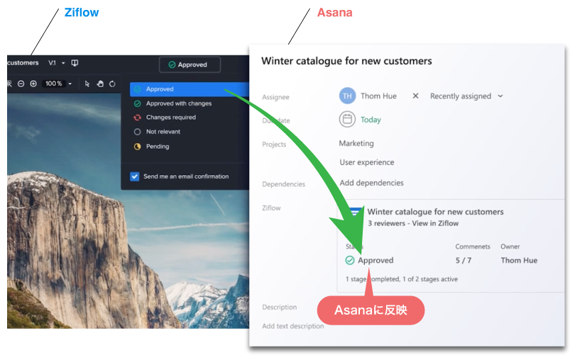 ワークマネジメントツール「Asana」から、直接Ziflowにプルーフを作成できます。Ziflowで変更されたステータスは自動的にAsanaに反映されます。