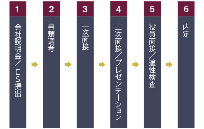 会社説明会から役員面接まで2ヶ月程度で実施予定です。会社説明会にご参加いただいた方へESの詳細をご案内させていただきます。選考にエントリーされる方は会社説明会へのご参加が必須となりますのでご注意ください。